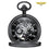 Cette magnifique montre à gousset à complication possède 4 différents types de métaux idéaux pour avoir le look parfait. Or, argent, bronze ou noir carbone, choisissez le modèle qui ira le mieux avec votre tenue. Son boitier poli et brillant possède un clapet  qui protège son précieux mouvement mécanique à remontage manuel. Pendant la lecture de l'heure, il est possible d'admirer son élégant verre cadran à décorations de gravures sophistiqués, comme pour imiter le mouvement à complication. L'index blanc à chiffres romain contraste le cœur mécanisé où l'on aperçoit les rouages horlogers en plein mouvement pour faire trotter les élégantes aiguilles dorées. Le cadran intègre un chronographe très pratique pour chronométrer des performances sportives ou artistiques. Pour un cadeau, une première montre de poche ou pour simplement changer de style, cette montre à gousset à complication est l'objet parfait !